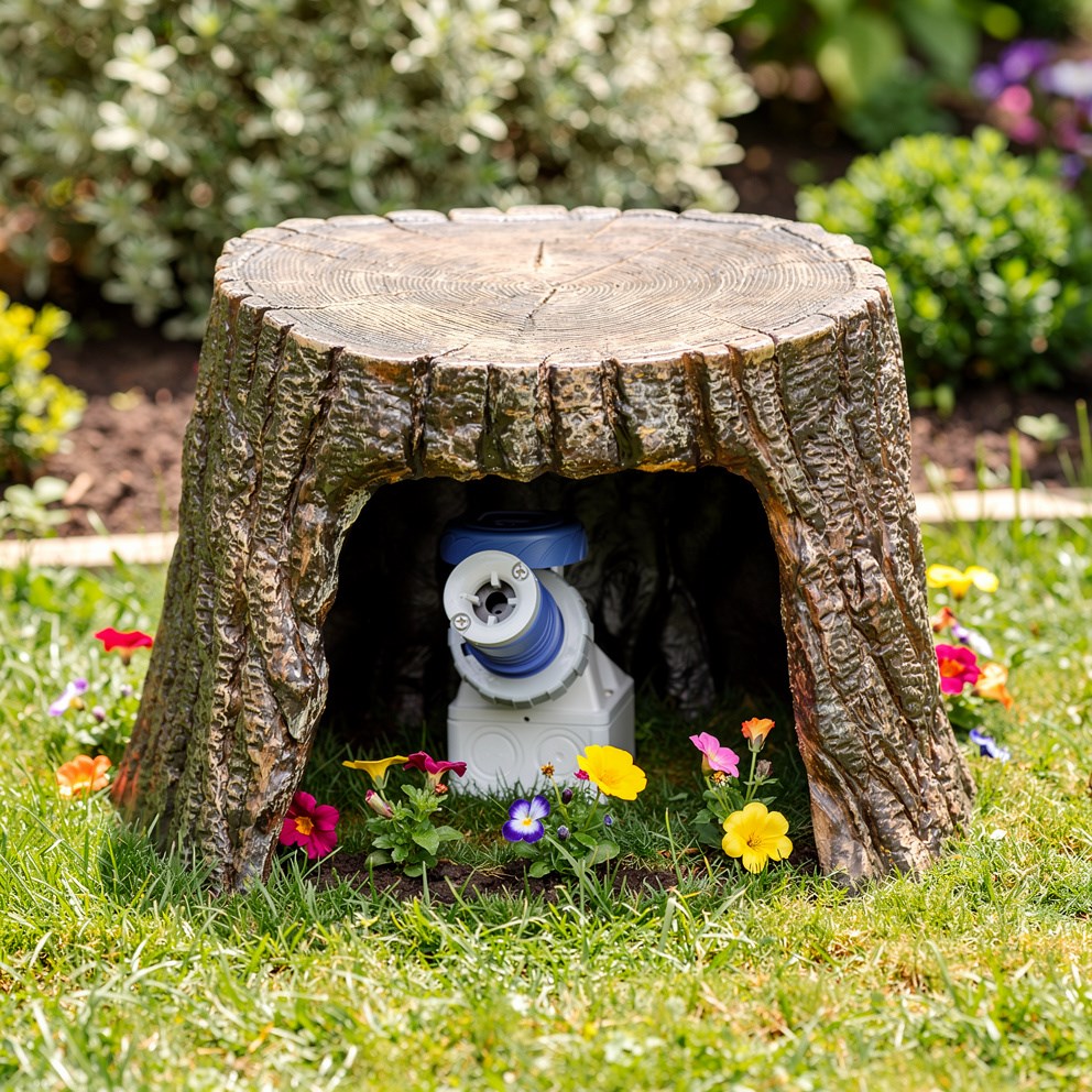 Благодаря натуральному дизайну под пень, изделие гармонично вписывается в любой ландшафт, будь то классический сад, современный парк или терраса. Крышка выполнена из высококачественного полистоуна — материала, который сочетает в себе легкость, прочность и устойчивость к погодным условиям. Встроенный доступ к садовой розетке позволяет легко подключать поливочные системы и технику. Ширина 32 см делает крышку идеальной для стандартных садовых розеток.