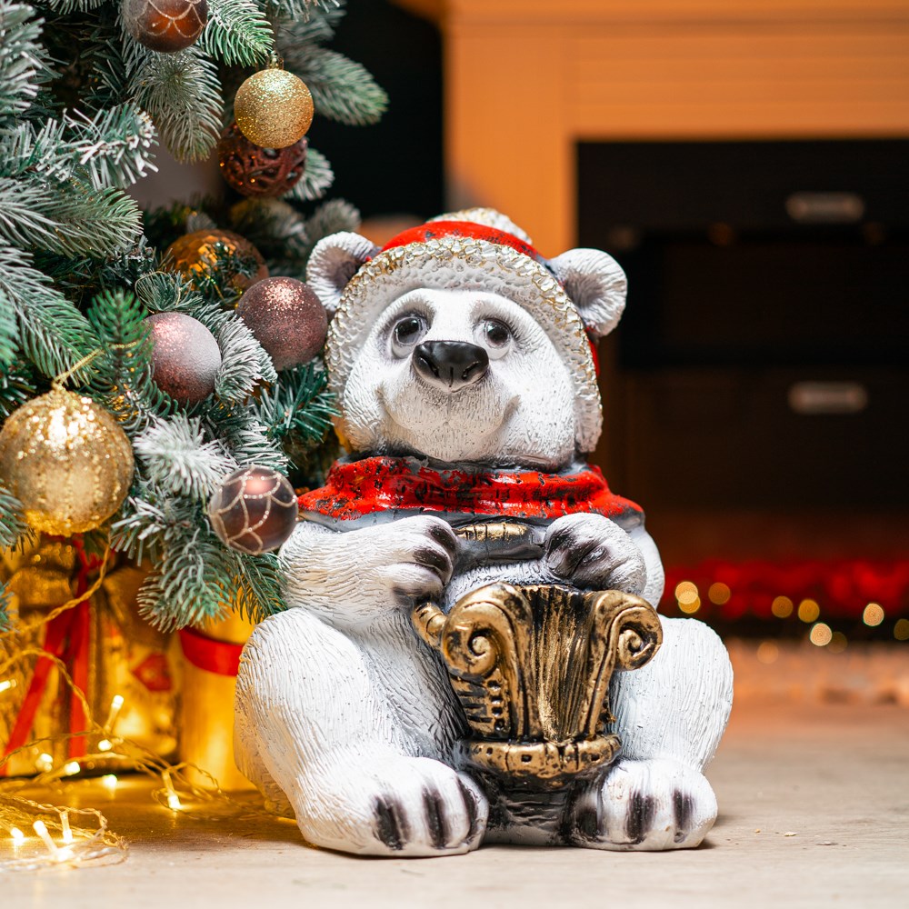 Пригласите милого медвежонка в новогоднее волшебство! Декоративная новогодняя фигура Мишка модели F08528 – очаровательная и уютная скульптура из стеклопластика, высотой 43 см, для любителей новогодних украшений, домашнего декора и создания теплой атмосферы. Этот мишка, украшенный новогодними атрибутами, идеально подходит для размещения на полке, столе, камине или в детской комнате, добавляя нотку нежности, тепла и праздничной радости в ваш интерьер.
