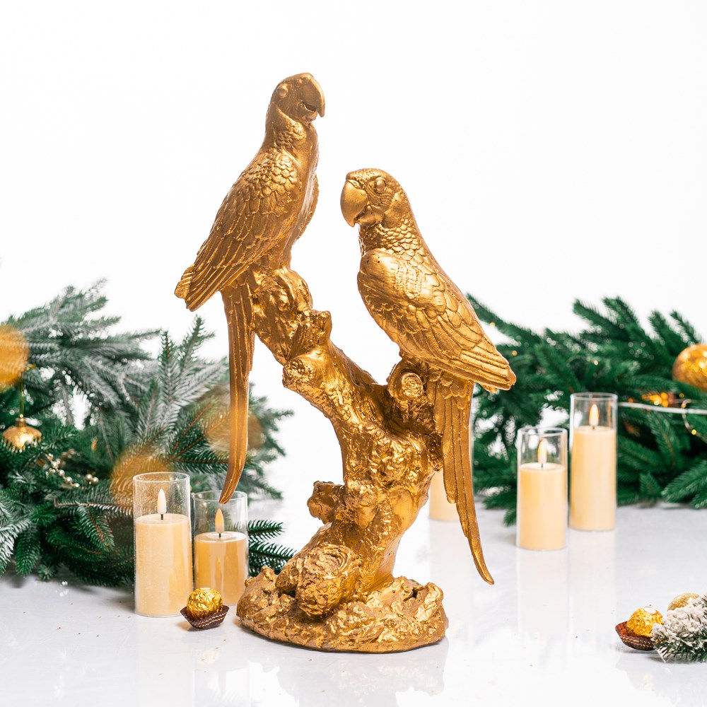 Добавьте тропический шарм в ваш новогодний декор! Декоративная новогодняя фигура Попугаи модели F01306-G – яркая и весёлая скульптура из полистоуна (полимерного камня), высотой 40 см, для любителей новогодних украшений, домашнего декора и создания неповторимой атмосферы. Эта композиция с попугаями идеально подходит для размещения на камине, полке, столе или подоконнике, привнося нотку экзотики и праздничного веселья в ваш интерьер.