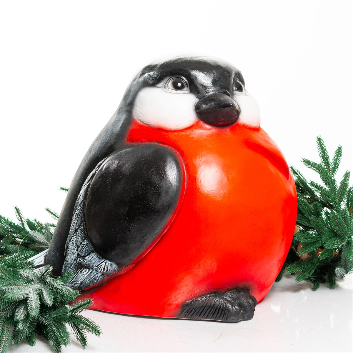 Фигура хорошо смотрится у входной группы, на террасе, в саду, у елки или на новогодней фотозоне. Компактное основание позволяет ставить снегиря на любую ровную поверхность, комбинировать с искусственной или живой хвоей, гирляндами и другими новогодними фигурами