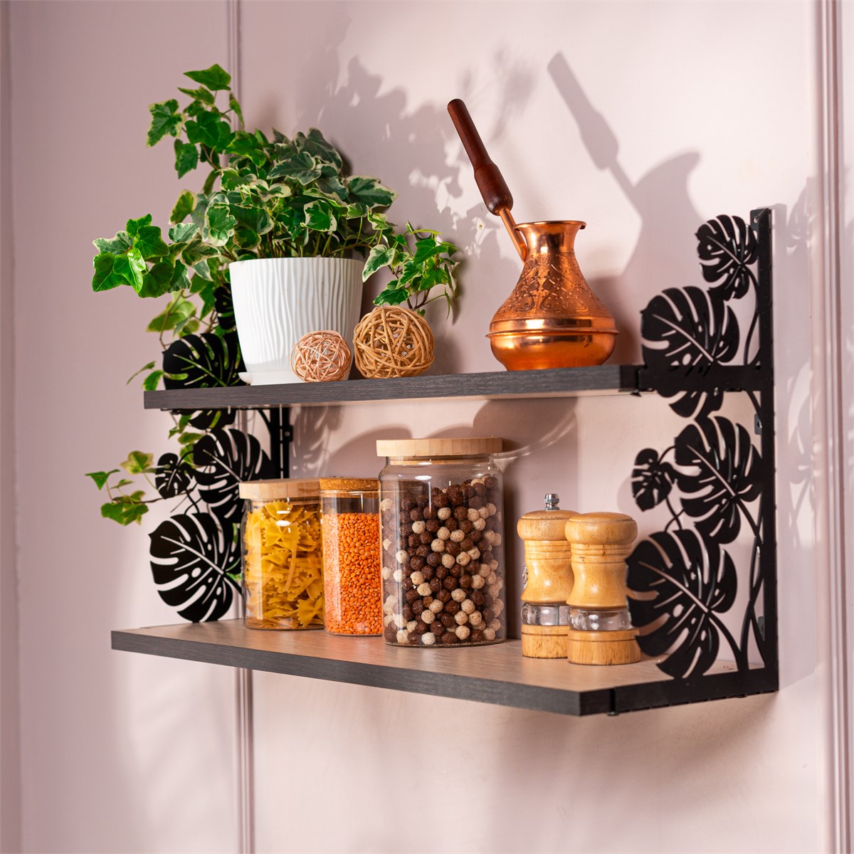 Полка 702-260B-DL60 имеет два яруса ЛДСП на прочных металлических кронштейнах с рельефными листьями монстеры, выдерживающих значительный вес. Простое крепление на стену (бетон, гипсокартон) входящими в комплект метизами, влагостойкая ЛДСП и антикоррозийный металл обеспечивают долговечность.