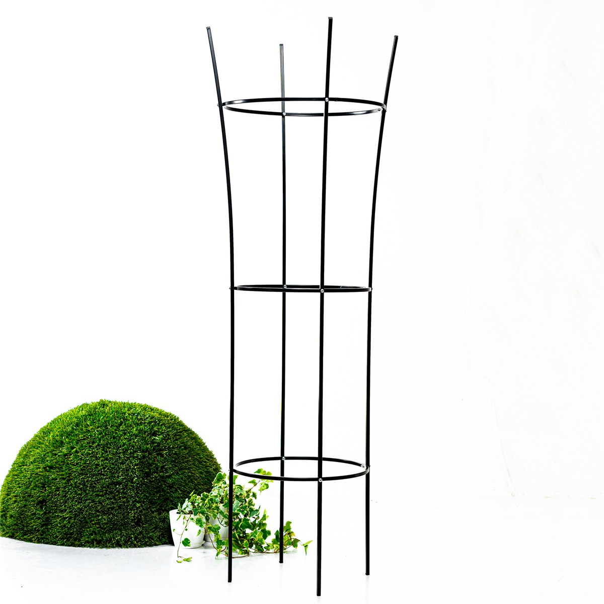 Подходит для крупных кустов роз, высоких пионов, гортензий, клематисов или вьющихся растений в клумбе или на газоне. Высота 150 см обеспечивает опору для самых рослых сортов без затенения, гармонирует с современным, прованским или классическим стилем участка.