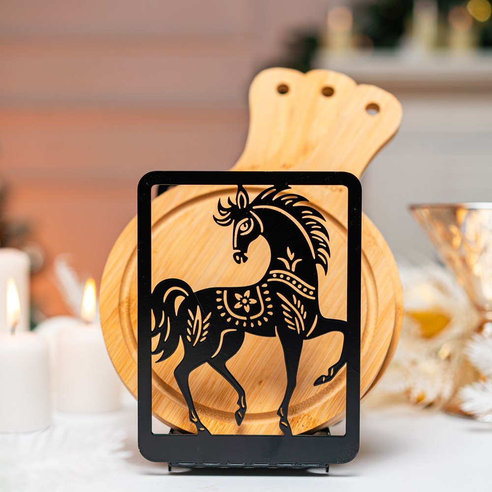 Организуйте кухню с изяществом и символизмом! Металлическая подставка для разделочных досок в форме Лошади – элегантного символа года по восточному календарю – модели 300-234 станет практичным и стильным аксессуаром для любой кухни. Она удерживает доски вертикально, экономя место и обеспечивая гигиену.