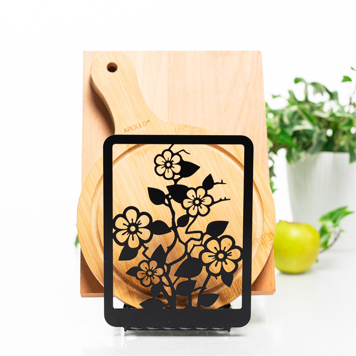 Подставка изготовлена из высокопрочного металла с матовым порошковым покрытием, устойчивого к влаге, перепадам температур и царапинам. Тонкая ручная гравировка лепестков сакуры придаёт изделию японскую эстетику, превращая его из простой аксессуарной детали в элемент декора кухни. Идеально подходит для современных интерьеров в стилях ваби-саби, скандинавском, минимализме и лофте.