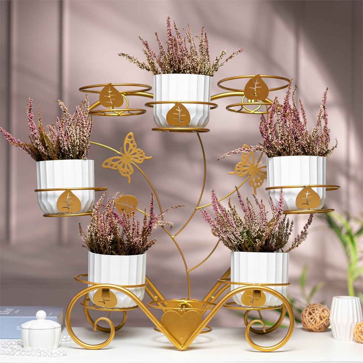 Разборная металлическая подставка 41-024R золотого цвета для 8 кашпо d=12 см в форме сердца с бабочками создаёт мини-сад на подоконнике, кухне или балконе. Изготовлена из прочной стали с порошковым покрытием, устойчива к коррозии и механическим повреждениям. Легко собирается за 3 минуты без инструментов, подходит для фиалок, суккулентов или трав. Высота 63 см идеальна для подоконников. Вес 2,6 кг упрощает перемещение.