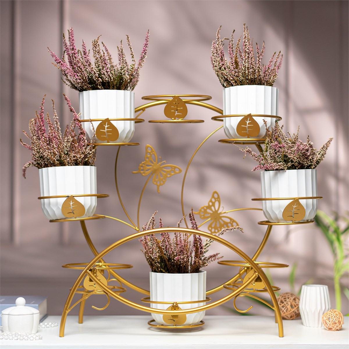 Разборная металлическая подставка 41-025R золотого цвета для 8 кашпо d=12 см с бабочками и листочками создаёт мини-сад на подоконнике, кухне или балконе. Изготовлена из прочной стали с порошковым покрытием, устойчива к коррозии и механическим повреждениям. Легко собирается за 3 минуты без инструментов. Подходит для фиалок, суккулентов или трав. Высота 60 см идеальна для подоконников. Вес 2,4 кг упрощает перемещение.