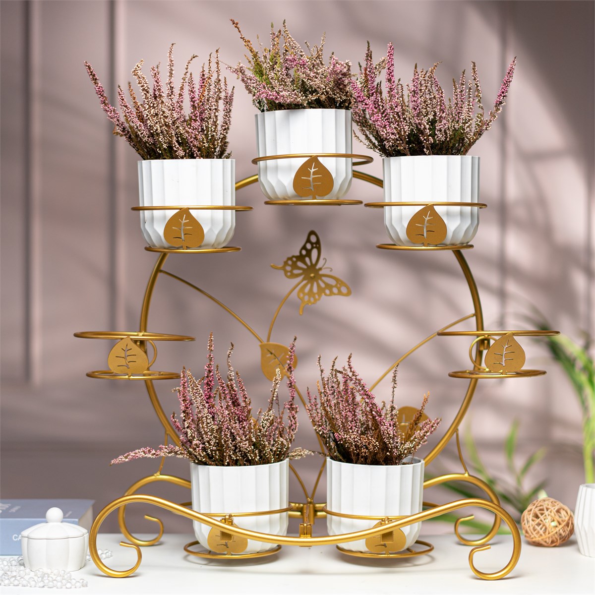 Разборная металлическая подставка 41-026R золотого цвета для 7 кашпо d=12 см с бабочками и листочками создаёт мини-сад на подоконнике, кухне или балконе. Изготовлена из прочной стали с порошковым покрытием, устойчива к коррозии и механическим повреждениям. Легко собирается за 3 минуты без инструментов. Подходит для фиалок, суккулентов или трав. Высота 50 см идеальна для подоконников. Вес 2,3 кг упрощает перемещение.