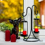 Настольный подсвечник на две свечи. Изготовлен из металла. Покраска в черный цвет. Свечи, новогодние аксессуары в комплект не входят, используются для фотосъемки.