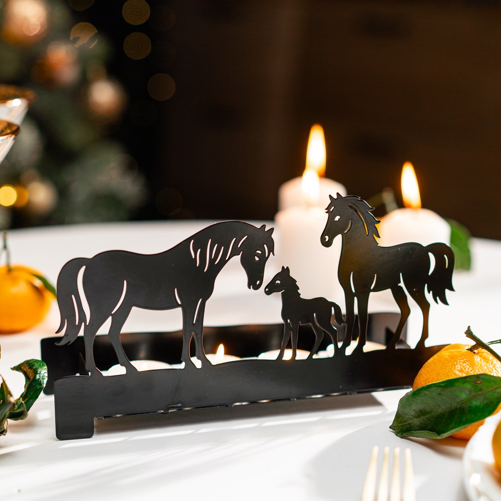 Принесите удачу и праздничное сияние в свой дом! Металлический подсвечник с Лошадьми – символа года по восточному календарю – модели 730-090 станет элегантным украшением вашего новогоднего интерьера. Идеален для камина, стола или подоконника, где он создаёт тёплую атмосферу и наполняет пространство магией праздника.