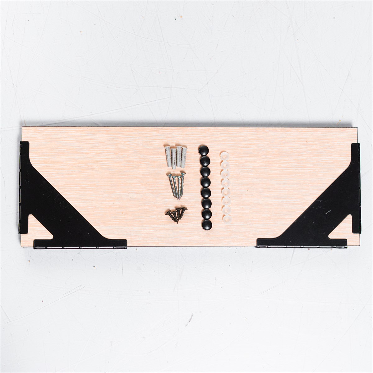 - Прочность и долговечность: Металлические кронштейны надёжны, устойчивы к коррозии и деформациям. ЛДСП защищено от царапин, влаги и выцветания, обеспечивая долгий срок службы без потери вида.
