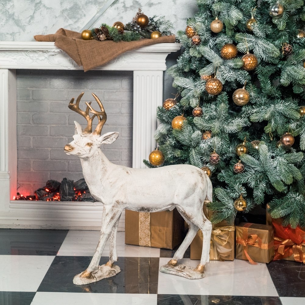 Фигура Олень хорошо передает красоту и грациозность животного. Основными достоинствами являются натуральная величина и волшебный белый с золотом окрас. Изделие выполнено из прочного материала – стеклопластика, и покрыто износостойкой краской, что позволяет долгое время выдерживать испытания всех времен года.