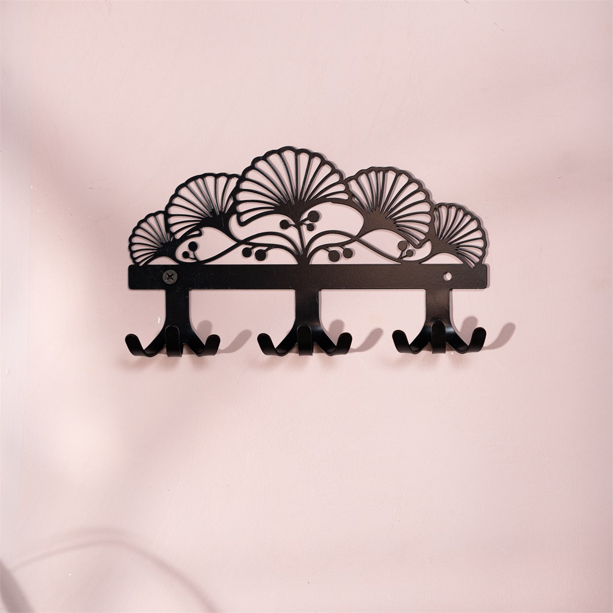 Вешалка 701-057B выполнена из металла с матовым чёрным покрытием, устойчивым к коррозии и царапинам. Декор с силуэтами листьев создаёт объёмный рельеф, три загнутых крючка удобно размещают куртки, сумки, ключи или полотенца. Ширина 20 см подходит для компактных пространств.
